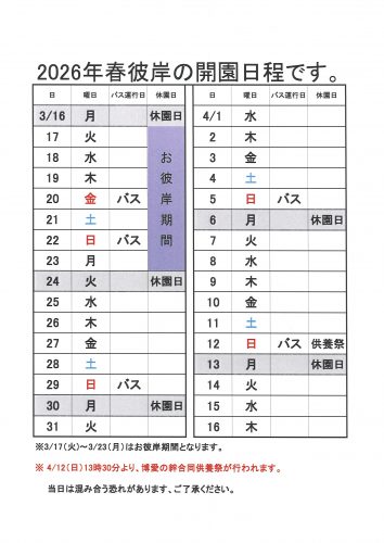 さて、3月のお彼岸期間の日程と「博愛の絆」合同供養祭の日程も併せてお知らせします。